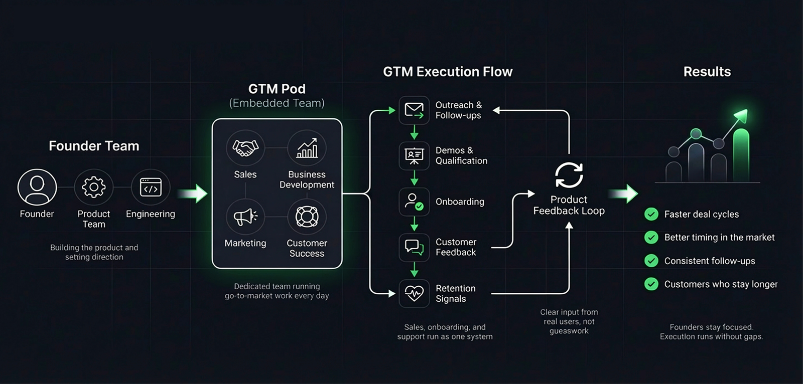 GTM Pods takes such workflows off your plate. Dedicated go-to-market teams handle sales, follow-ups, onboarding, and customer success daily, so you can focus on the product, refine first impressions, and turn early interest into long-running customers. Give your product a fair chance to outpace its competitors and win.